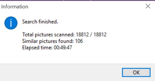 - Once the program finishes the search the program will show you how many pictures were found, how many duplicates were found and how long the search took to complete.