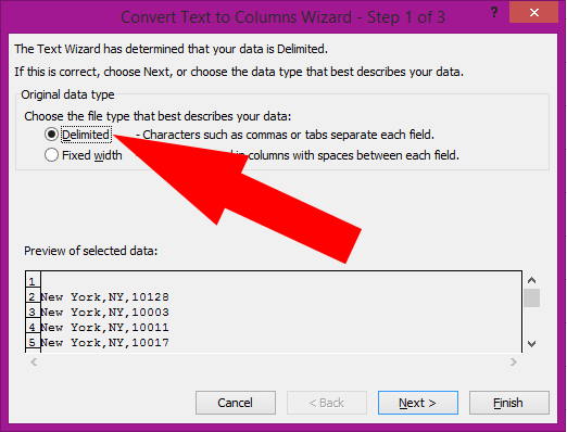- Again, when the text to columns wizard opens, select delimited from the 1st window and click next.