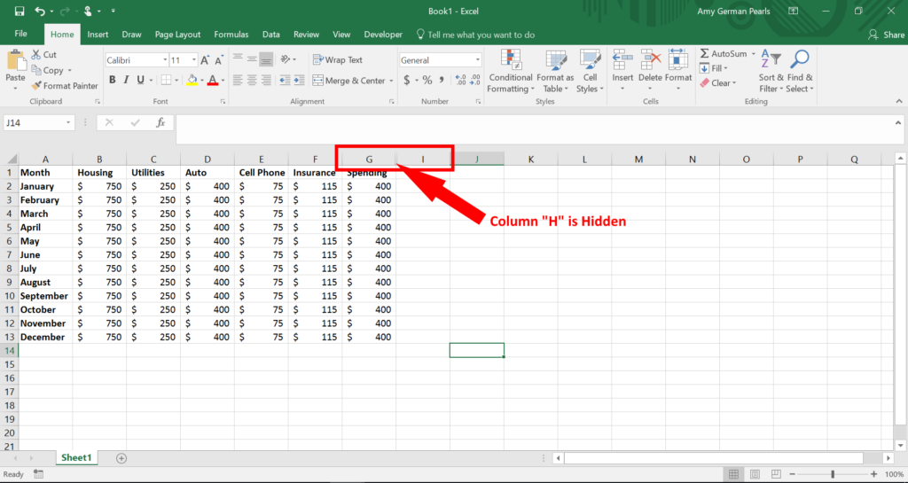 An easy way to see if a column is hidden in Excel is to scan across the column headers and see if any letters are missing. For example, in the spreadsheet below we see column A, B, C, D, E, F, G and then I. Where’s “H”? That column is hidden in this Excel spreadsheet.