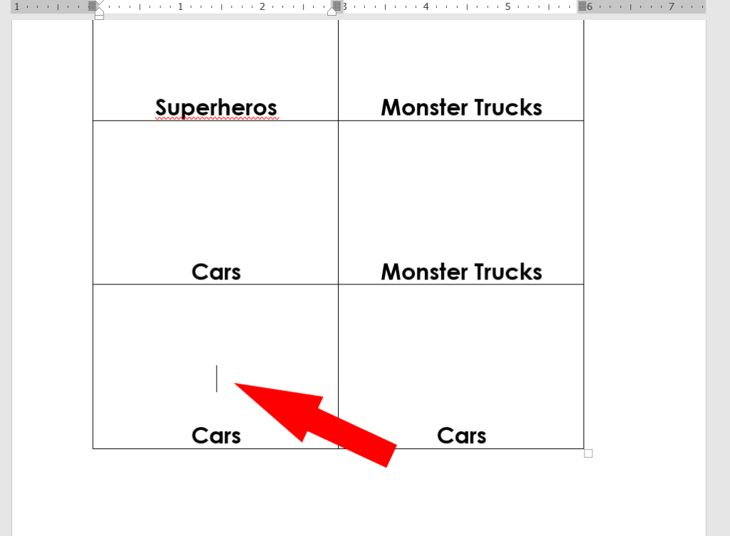 Next let’s add pictures to each label. I want my picture before the words in each label. So, to insert a picture before the cars label click in front of the word cars so your cursor is there. Then, click the enter key twice to add two rows above the word and click the back arrow two times. Your cursor should now be above the word, toward the center of the label.